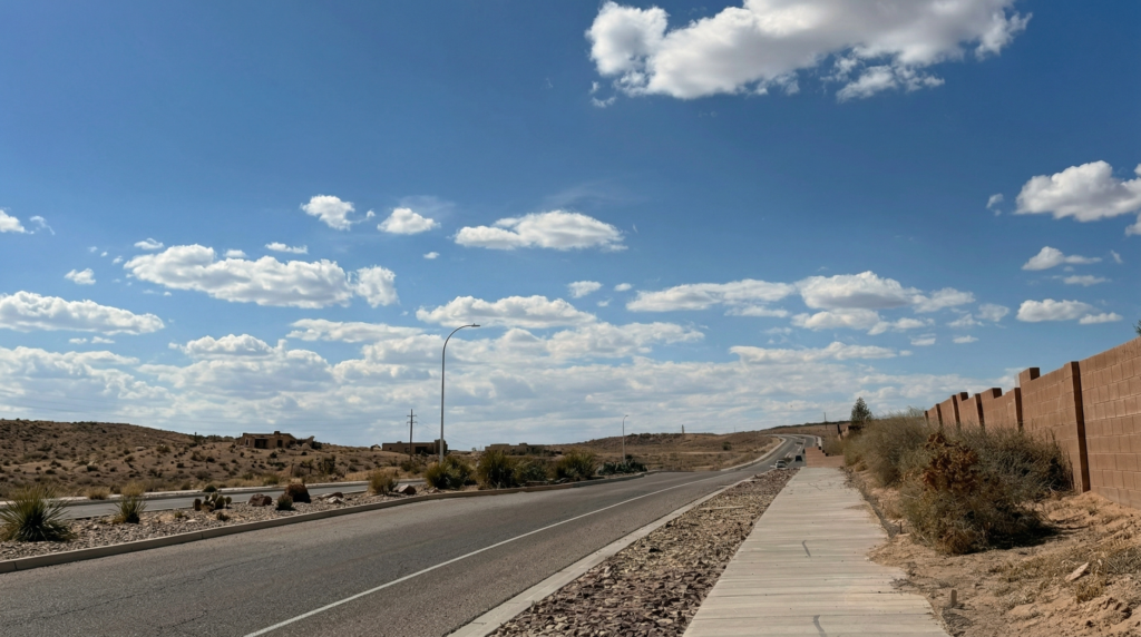 As always, view of the Sandia Mountains doing what they always do, sitting enormous and steady at the edge of everything. And then I noticed a construction project I recognized from the road, Sandoval Flats, a project I had worked on in a previous chapter of my life from the administrative and accounting side of things. To see it standing there, real and built and growing, made my heart genuinely happy. You do not always get to see where your small contributions land.